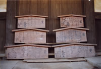 本市に現存する太政官高札は6枚あり、大きさには大・中・小の三種類があります。形としては庇(ひさし)の付いた家形の大きな一枚板で、そこに毛筆で禁令が書かれています。時代劇などで立札がよく登場しますが、これをもう少し立派にしたような物です。