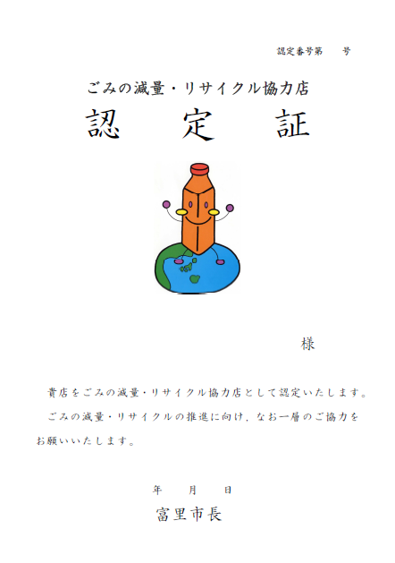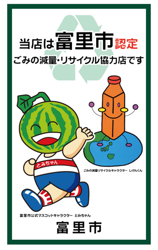 市ではごみの減量・リサイクル運動を促進するための取り組みの一つとして、消費の段階からごみの発生を抑え、また、不用となったものをリサイクルすることを目的に、ごみの減量・リサイクル活動を積極的に実施する小売販売店を「富里市ごみの減量・リサイクル協力店」に認定しています。