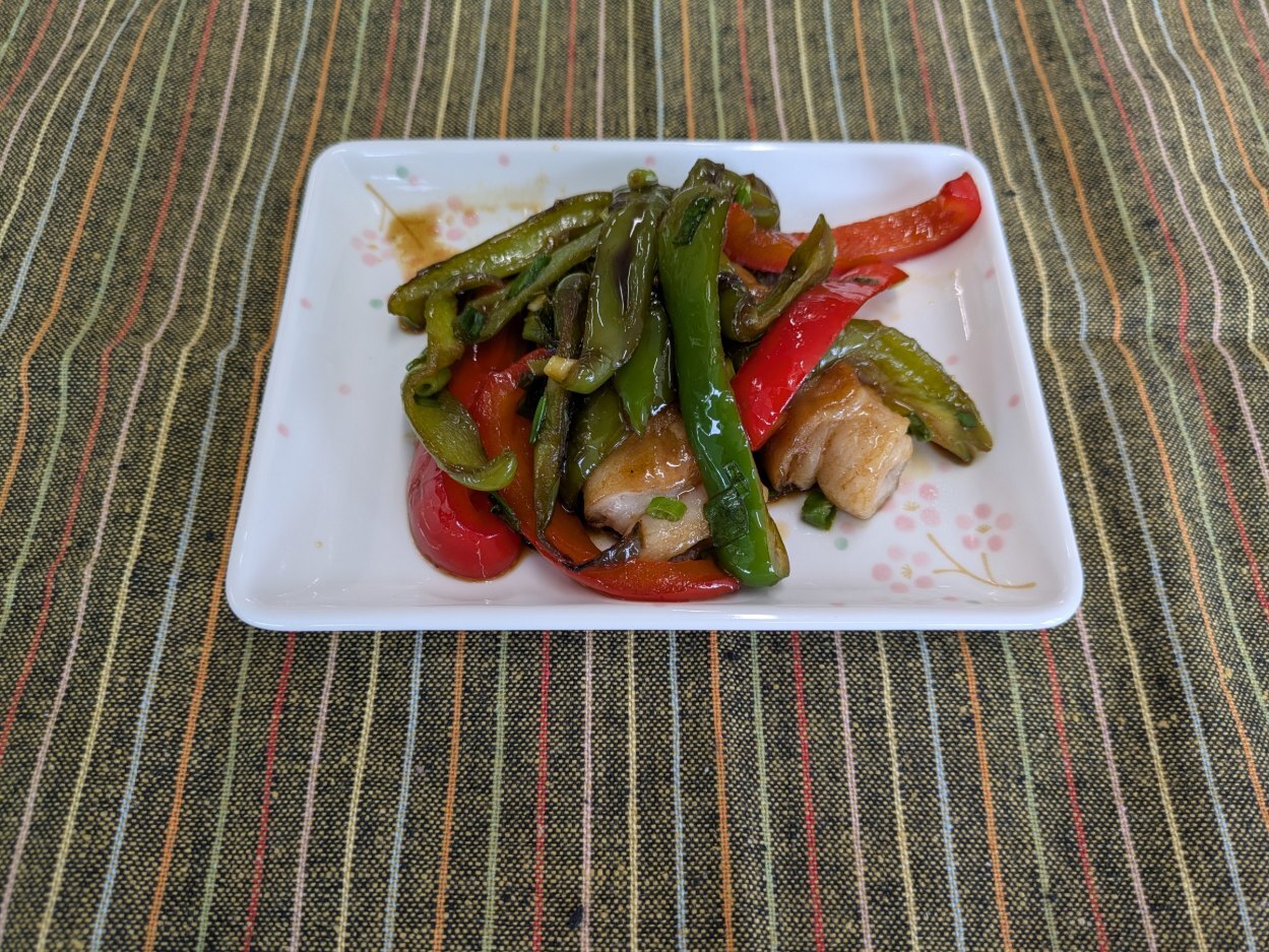 - フライパンを熱して、ごま油半量(大さじ1/2)を入れ、豚肉を焼く。豚肉に火が通ったら取り出して、残りのごま油(大さじ1/2)を入れ、パプリカとピーマンを炒める。