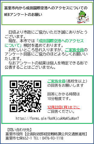 『富里市内から成田国際空港へのアクセス』WEBアンケート実施中