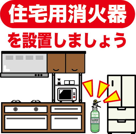 - 火災を小さいうちに消すために、消火器を設置し、使い方を確認しておく。