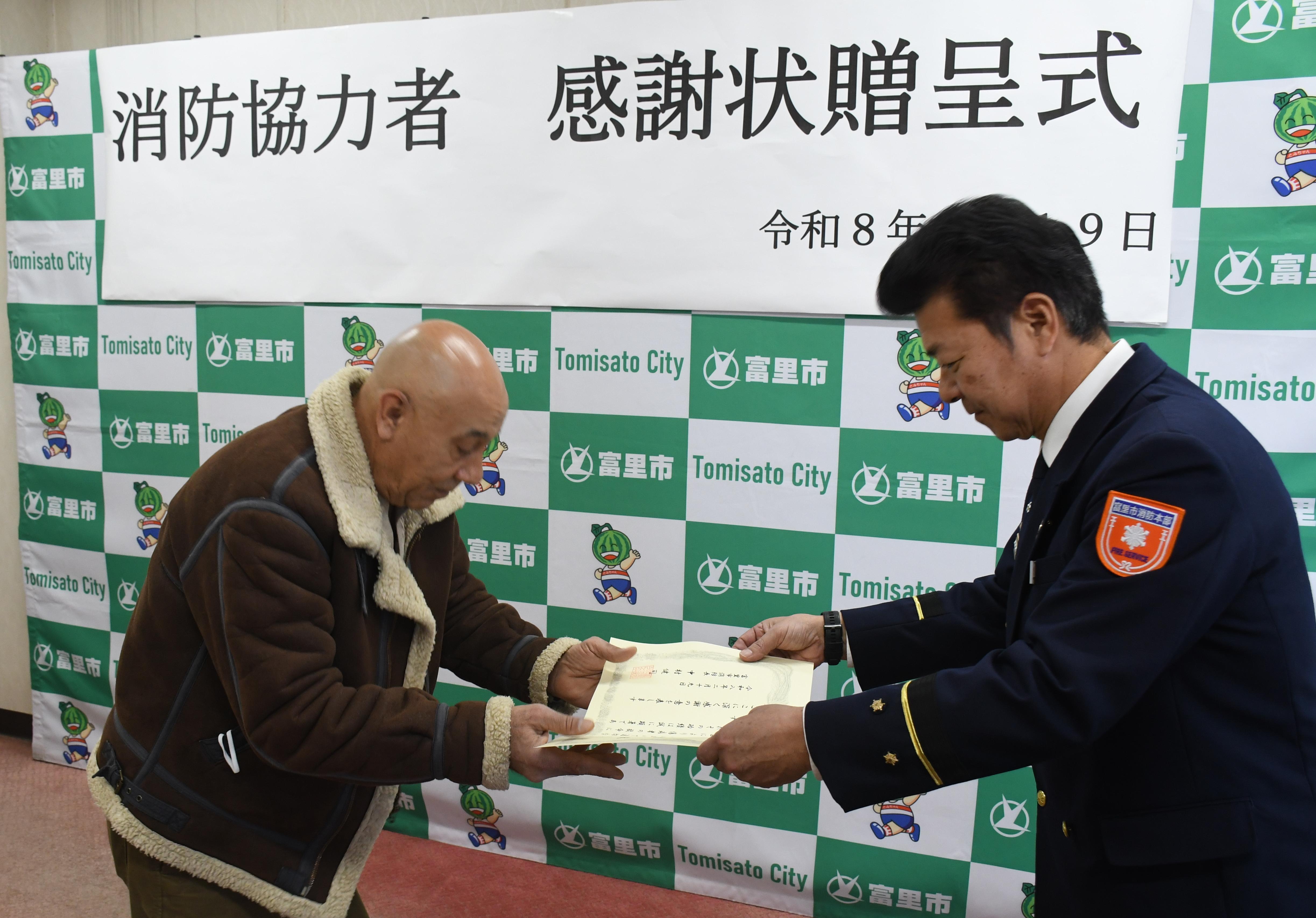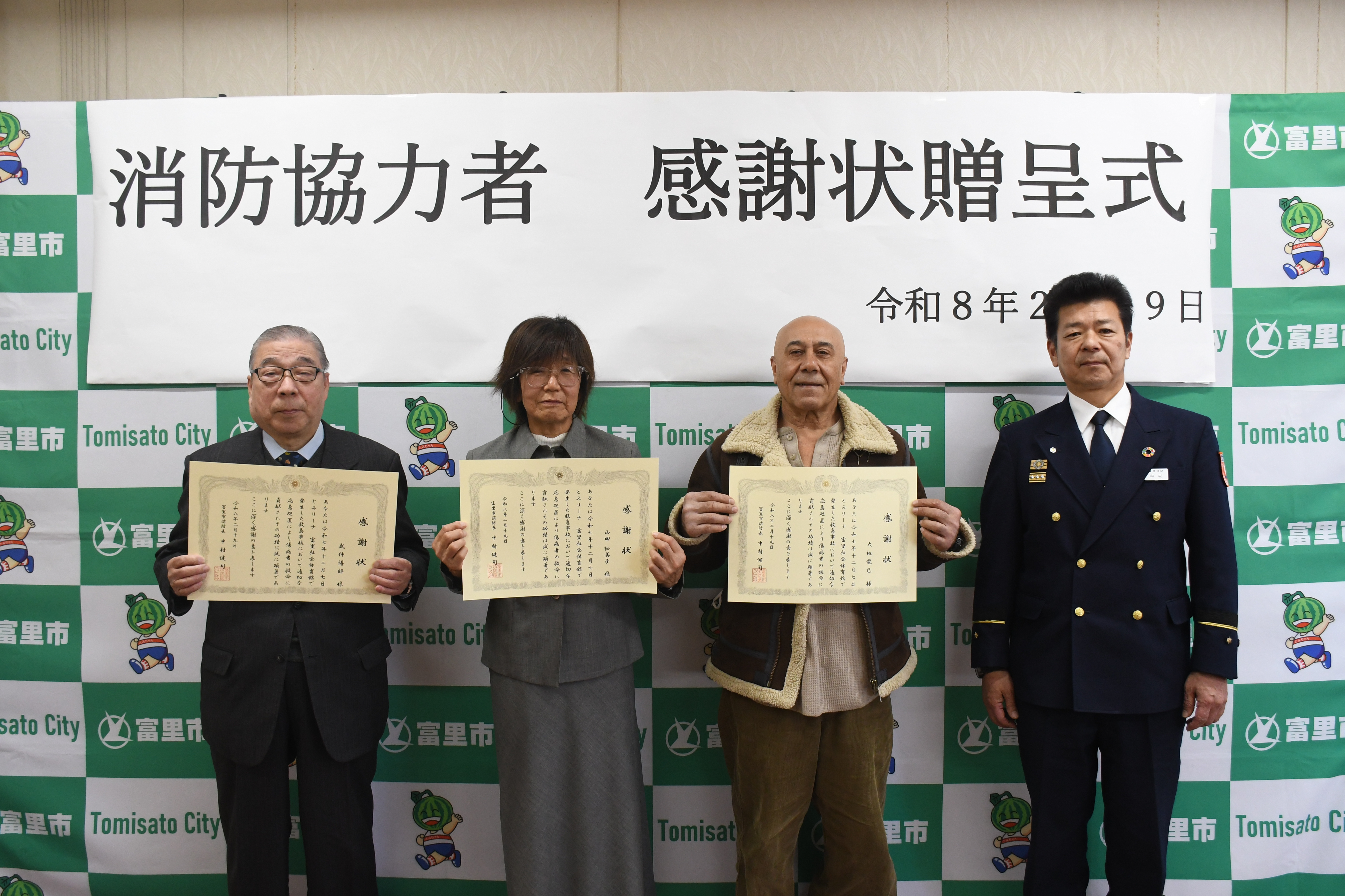 心肺停止状態に陥った傷病者への迅速な応急処置により、傷病者の社会復帰に貢献した一般協力者4名の方に敬意を表するとともに、その功績を称えるため、令和8年2月19日(木曜日)、富里市消防本部において、消防長から感謝状を贈呈しました。