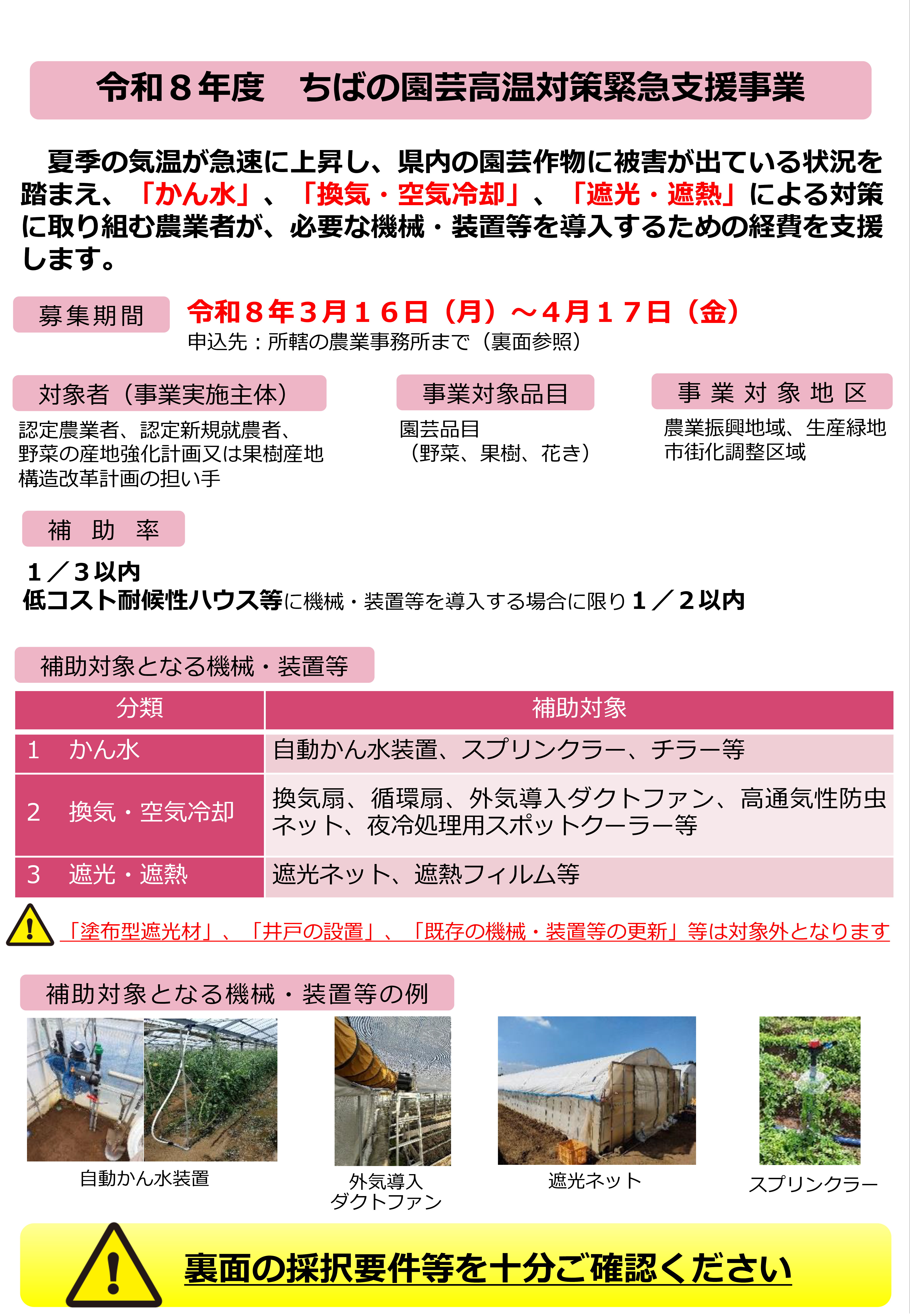 千葉県では、夏季の気温が急速に上昇し、県内の園芸作物に被害が出ている状況を踏まえ、「かん水」、「換気・空気冷却」、「遮光・遮熱」による対策に取り組む農業者が、必要な機械・装置などを導入するための経費を引き続き支援します。