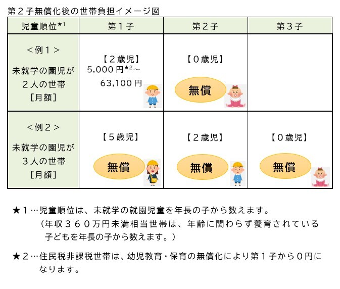 これまで国の基準により半額としていた第2子に当たる0から2歳児の保育料について、市独自支援策として無償化します。